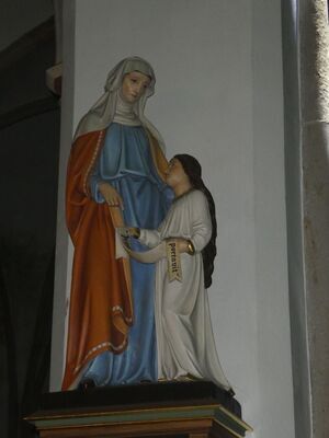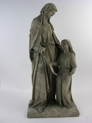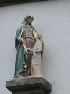 Eine ältere Frau und ein junges Mädchen stehen auf einer rechteckigen Bodenplatte mit rauer Oberfläche. Dargestellt sind die heilige Anna, die Mutter Marias, und Maria als junges Mädchen. Maria steht vor ihrer Mutter, zu der sie aufblickt. Marias Haar ist offen, gewellt und reicht ihr über die Taille hinaus. Sie ist gekleidet in ein bodenlanges Kleid, das in der Taille gegürtet ist. Ihre Arme sind angewinkelt. In beiden Händen hält sie ein langes Schriftband, das zerbrochen ist. Die rechte Hand Marias hält den größeren Teil des Schriftbandes, die linke, die das andere Ende hielt, ist abgebrochen. Die heilige Anna blickt nach unten zu Maria. Sie ist gekleidet in ein weites und ebenfalls in der Taille gegürtetes Kleid. Darüber trägt sie einen weiten, vorne offenen Mantel. Eine Kopfgebinde bedeckt vollständig Stirn, Haare und Hals. Das über die Schultern hinausreichende Tuch liegt kunstvoll als Haube drapiert über dem Kopf. Das Gesicht ist unbedeckt. Die rechte Hand Annas, die etwas hielt, ist abgebrochen, die linke berührt den Rücken Marias. Die in Holz und bunt gefasste Skulptur steht am Pfeiler im Mittelschiff links in der Kirche St. Marien in Neustadt/Weinstraße. Die Skulpturengruppe steht auch außen an der Annakapelle in Burrweiler.