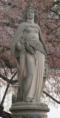 Gewandfigur einer jung anmutenden Frauengestalt mit einem Lorbeerkranz auf dem bis zur Hüfte reichenden, gewellten Haar. Sie trägt ein bodenlanges Gewand, unter dem die Schuhspitzen hervorragen. Über dem Gewand trägt sie einen Umhang, der durch ein längeres Band mit Dekor oberhalb der Brust zusammengehalten wird. Der Oberkörper ist durch einen eng anliegenden Brustpanzer mit Schuppenpanzerung geschützt, der mit einem schmalen, gürtelähnlichen Abschluss in der Taille versehen ist. Unterhalb des Abschlusses fällt der Rock faltig bis zur Erde. Ein breiter Gürtel, dessen Oberfläche mit einer Reihe von Rechtecken verziert ist, fällt locker von der rechten Hüfte zur linken. Auf der rechten Körperseite wird der Umhang mit dem angewinkelten Arm nach oben angehoben und unter dem breiten Gürtel festgehalten. Die linke Hand stützt sie auf ein seitlich hinter ihr stehendes, spitz zulaufendes, verziertes Schild mit einer runden Aussparung auf der rechten Seite. Die rechte Hand, die ein Langschwert hielt, fehlt. Eine Umsetzung des Gipsmodells in Stein als Germania ist das Kriegerdenkmal von 1870 in Neuhofen/Pfalz.