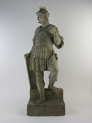 Gewandfigur eines römischen, bartlosen Zenturios. Er steht auf einem zweistufigen Treppenpodest, mit dem rechten Bein auf der unteren Stufe und mit dem linken Fuß auf der oberen Stufe. Er trägt einen Helm mit Wangenschutz, Klappvisier und Helmschmuck, der beschädigt ist. Der Soldat ist gekleidet in eine oberschenkellange Tunika mit Ärmeln, die bis zum Armgelenk nach oben gewickelt sind und dadurch die muskulösen Unterarme sichtbar werden lassen. Über der Tunika trägt er einen Spangenpanzer, bestehend aus vier breiten Bändern, die vor der Brust mit jeweils zwei Knöpfen zusammengehalten werden. Am unteren Rand des Brustpanzers sind Bänder befestigt, die nach unten hängen und den Unterkörper schützen sollen. Der Zenturio trägt Strümpfe, die die Zehen frei lassen und Soldatensandalen. An seiner linken Seite hängt am Gürtel ein Kurzschwert. Sein Oberkörper ist nach rechts gedreht. Sein Blick ist nach rechts gerichtet. Die rechte Hand liegt auf einem rechteckigen Schutzschild, welches der gesamten Plastik Standfestigkeit gibt. Der linke Arm ist angewinkelt und zeigt nach oben. Aufgrund der Hand- und Fingerstellung scheint er in der linken Hand eine Lanze gehalten zu haben. Gottfried Renn schuf die Skulptur 1856 im Auftrag des Domkapitels als Ersatz für die zerstörten gotischen Figuren. Die Figur steht ausgearbeitet auf dem Ölberg südlich des Domes zu Speyer.