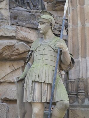 Gewandfigur eines römischen, bartlosen Zenturios. Er steht auf einem zweistufigen Treppenpodest, mit dem rechten Bein auf der unteren Stufe und mit dem linken Fuß auf der oberen Stufe. Er trägt einen Helm mit Wangenschutz, Klappvisier und Helmschmuck, der beschädigt ist. Der Soldat ist gekleidet in eine oberschenkellange Tunika mit Ärmeln, die bis zum Armgelenk nach oben gewickelt sind und dadurch die muskulösen Unterarme sichtbar werden lassen. Über der Tunika trägt er einen Spangenpanzer, bestehend aus vier breiten Bändern, die vor der Brust mit jeweils zwei Knöpfen zusammengehalten werden. Am unteren Rand des Brustpanzers sind Bänder befestigt, die nach unten hängen und den Unterkörper schützen sollen. Der Zenturio trägt Strümpfe, die die Zehen frei lassen und Soldatensandalen. An seiner linken Seite hängt am Gürtel ein Kurzschwert. Sein Oberkörper ist nach rechts gedreht. Sein Blick ist nach rechts gerichtet. Die rechte Hand liegt auf einem rechteckigen Schutzschild, welches der gesamten Plastik Standfestigkeit gibt. Der linke Arm ist angewinkelt und zeigt nach oben. Aufgrund der Hand- und Fingerstellung scheint er in der linken Hand eine Lanze gehalten zu haben. Gottfried Renn schuf die Skulptur 1856 im Auftrag des Domkapitels als Ersatz für die zerstörten gotischen Figuren. Die Figur steht ausgearbeitet auf dem Ölberg südlich des Domes zu Speyer.