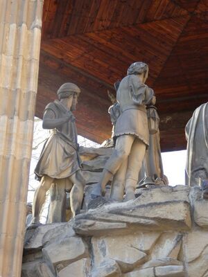 Gewandfigur eines Schergen mit kurzem Haupthaar und langem Oberlippenbart. Er steht auf einer unregelmäßig geformten Basis an einen Baumstamm angelehnt, da die Plastik nicht als freistehende Skulptur konzipiert ist. Den rechten, angewinkelten Arm hält er vor die Brust. In der beschädigten rechten Hand hält er eine Laterne. Der linke Arm ist angehoben. In der linken Hand hält er ein Kurzschwert, das mit seiner Spitze an seiner linken Schulter angelehnt ist. Die Spitze des Schwertes ist abgebrochen. Er trägt ein kurzes Gewand, das am unteren Rand mit einer Zierbordüre versehen ist und das bis etwa zur Mitte seiner Oberschenkel reicht. Die Ärmel des Kleides sind nach oben gerollt. Unter dem Gewand trägt er eine wadenlange eng anliegende Hose. Seine Füße sind nackt, dies deutet auf eine niedrige gesellschaftliche Stellung hin. Der Körper und der Blick sind nach rechts gewandt. Das Gipsmodell ist mit metallenen Messpunkten versehen. Die Figur steht ausgearbeitet auf dem Ölberg südlich des Domes zu Speyer. Gottfried Renn schuf die Figur 1856 im Auftrag des Domkapitels als Ersatz für die zerstörten gotischen Figuren.