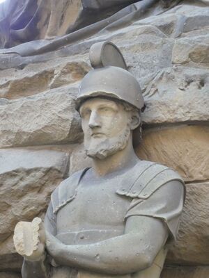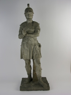 Vollplastisch ausgearbeitetes Gipsmodell eines römischen Soldaten in Rüstung. Er trägt einen Kinnbart und lehnt an einem Baumstamm. Sein linkes Bein, das vor dem etwa hüfthohen Baumstumpf steht, ist vor das rechte gestellt. Der Soldat trägt ein die Oberschenkel bedeckendes und im unteren Bereich faltenreiches Gewand mit kurzen Ärmeln (Tunika). Sein Kopf ist geschützt durch einen Helm mit Helmzier aber ohne Wangenschutz. Die Beine sind bis zu den Knöcheln nackt. Die Schuhe, Soldatensandalen/Strümpfe, reichen über die Knöchel. Über dem Gewand trägt er einen Brustpanzer. Der Brustpanzer wird durch breite Lederstreifen über den Schultern befestigt und die Schultern so gleichzeitig geschützt. Über dem Brustpanzer trägt er einen breiten Gürtel, der aus fünf breiten Lederstreifen besteht, die vorne mit jeweils zwei Knöpfen zusammengehalten werden. An dem Gürtel hängt links ein Kurzschwert. Seine linke Hand liegt auf dem rechten Handgelenk. Die beschädigte rechte Hand, die nach vorne zeigt, ist geöffnet. Auf dem Kopf trägt er einen Helm mit Helmzier. Mit metallenen Messpunkten. Die Figur steht in Stein gehauen auf dem Ölberg südlich des Domes zu Speyer. Gottfried Renn schuf die Figur 1856 im Auftrag des Domkapitels als Ersatz für die zerstörten gotischen Figuren.