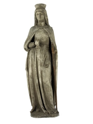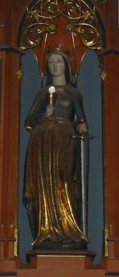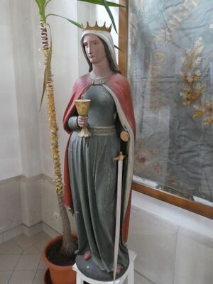 Heilige Barbara mit Krone und hüftlangem Kopftuch. Sie trägt ein gegürtetes Untergewand. Das Obergewand/der Mantel wird über der Brust von einem Band zusammengehalten. In der Linken hält sie ein Schwert, in der Rechten einen nicht identifizierbaren Gegenstand. Die in Holz ausgearbeiteten und bunt bemalte Heilige Barbara befindet sich einmal in der Kirche St. Marien in Neustadt und weiter in der Kirche St. Johannes Baptist in Harthausen.