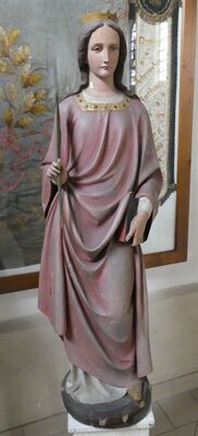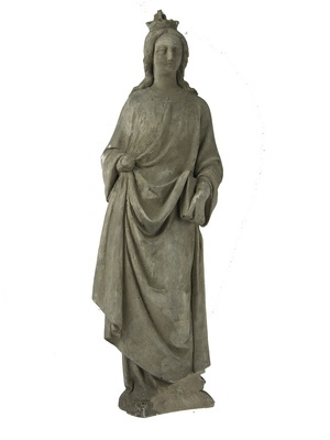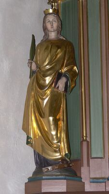 Plastik der Katharina von Alexandrien mit Krone und hüftlangem Haar. Sie trägt ein langes Gewand mit weiten Ärmeln, welches sie mit der rechten Hand nach oben anhebt. In der Linken trägt sie ein Buch. Auf der Krone war vermutlich noch ein Aufsatz, der jedoch nicht mehr vorhanden ist. Es fehlen noch weitere Teile der Krone. Aufgrund der Umsetzung der vollständigen Figur am Seitenaltar in der Kirche St. Marien in Neustadt an der Weinstraße sowie in St. Johannes Baptist in Harthausen und am Seitenaltar links in St. Nikolaus in Bellheim ist eine Zuschreibung als Heilige Katharina von Alexandrien möglich. Die Umsetzung der vollständigen Skulptur in Holz und bunt gefasst, befindet sich am Seitenaltar in der Kirche St. Marien in Neustadt an der Weinstraße, sowie in St. Johannes Baptist in Harthausen und am Seitenaltar links in St. Nikolaus in Bellheim.
