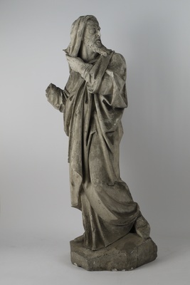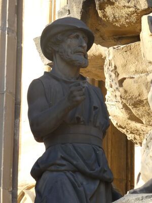 Gewandfigur eines vollplastisch ausgearbeiteten Modells eines bärtigen Schergen bei der Gefangennahme Jesu. Er steht auf einem halbrunden, leicht gewölbten Sockel. In der linken Hand hält er eine Keule. Die rechte, erhobene Hand ist zur Faust geballt. Gekleidet ist der Dargestellte in ein ärmelloses Gewand (Tunika), das mit Hilfe des Gürtels nach oben bis über die Knie gerafft ist. Der Körper ist leicht nach links gedreht. Das linke Bein ist durch einen Baumstumpf, der der Plastik Standfestigkeit geben soll, verdeckt, Der Kopf ist mit einem Hut bedeckt, dessen rechte Krempe hochgeschlagen ist. Die Plastik ist mit metallenen Messpunkten ersehen. Die Figur steht ausgearbeitet auf dem Ölberg südlich des Domes zu Speyer. Gottfried Renn schuf die Figur 1856 im Auftrag des Domkapitels als Ersatz für die zerstörten gotischen Figuren des Meisters Hans von Heilbronn.