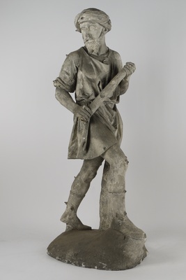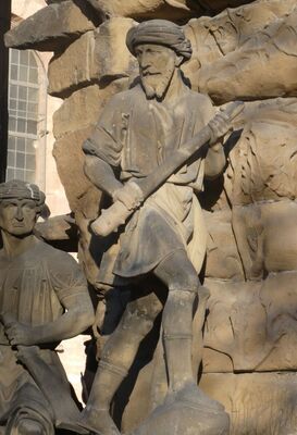 Vollplastisch ausgearbeiteter, bärtiger Scherge/Häscher bei der Gefangennahme Jesu mit turbanähnlicher Kopfbedeckung, einem Symbol für einen Ungläubigen. Er ist in ein oberschenkellanges, gegürtetes Gewand/Tunika, das etwas nach oben gerafft ist, gekleidet. Die Ärmel sind nach oben gekrempelt und lassen die Unterarme frei. Die leichten Stiefel reichen bis zur Wade. In beiden Händen trägt er eine Keule. Die Gestalt schreitet vorwärts, den Blick nach rechts hinten gewandt. Das rechte Bein steht etwas erhöht auf einem Stein. Ein Baumstamm hinter dem linken Bein stabilisiert die Skulptur. Mit metallenen Messpunkten. Die Skulptur steht in Stein gefertigt auf dem Ölberg südlich des Domes zu Speyer. Gottfried Renn schuf die Figur 1856 im Auftrag des Domkapitels als Ersatz für die zerstörten gotischen Figuren.