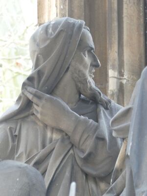 Gewandfigur auf einem achteckigen Sockel, der leicht nach oben gewölbt ist. Dargestellt ist ein älterer Mann, ein Ältester oder ein Schriftgelehrter mit einem langen, am Kinn spitz zulaufenden Vollbart. Er ist antikisch in ein bodenlanges, nur den linken, nackten Fuß freigebendes, weites und faltenreiches Gewand gekleidet. Mit der linken Hand streift der Dargestellte einen Teil des Überwurfs, der auch den Kopf bedeckt zur Seite. Er blickt nach links hinten über die linke Schulter. Der rechte Arm ist angewinkelt und zeigt nach außen. Die rechte Hand fehlt. Das linke Bein ist leicht angewinkelt. Die Gestalt scheint sich von der Szene entfernen zu wollen. Die Figur steht ausgearbeitet auf dem Ölberg südlich des Domes zu Speyer. Gottfried Renn schuf die Figur 1856 im Auftrag des Domkapitels als Ersatz für die zerstörten gotischen Figuren aus dem 16. Jahrhundert von Meister Hans von Heilbronn.