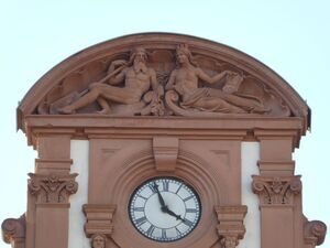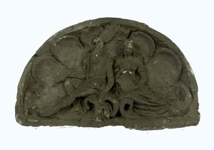 Modell eines Segmentbogens für den Lünettengiebel der Alten Münze in Speyer. Das Relief befindet sich in einem konkaven Rundbogen. In der Höhlung einer "Muschel" ist links vom Betrachter aus gesehen die allegorische Darstellung des Rheins als bärtiger Mann (Kopf fehlt), der rechts ein Ruder hält, dessen Blatt über den Kopf hinaus ragt. Der untere Teil des Ruders ist bruchstückhaft noch zu erkennen. Die linke Hand liegt auf einem Gefäß. Sein linkes Bein ist nach rechts ausgestreckt, das rechte ist angewinkelt. Ein Tuch bedeckt seine Hüften. Rechts befindet sich die allegorische Darstellung der Stadt Speyer, die Filia Spirae mit Mauerkrone, die in beiden Händen ein Wappenschild mit der Darstellung des Speyerer Domes hält. Sie hat langes, gewelltes Haar. Sie trägt ein kragenloses, langes, eng anliegendes und die Oberarme bedeckendes Kleid. Ihre Beine weisen vom Betrachter aus gesehen nach rechts. Beide Gestalten sitzen auf symbolisierten Wellen, die Liegen ähneln. Diese Darstellung könnte eine Vorstudie nach dem Entwurf des Architekten Heinrich Jesters für die Bildhauerarbeit für den Ostgiebel der alten Münze in Speyer gewesen sein. Das von Renn in Stein umgesetzte Relief befindet sich am Giebel der Ostseite der Münze in Speyer.