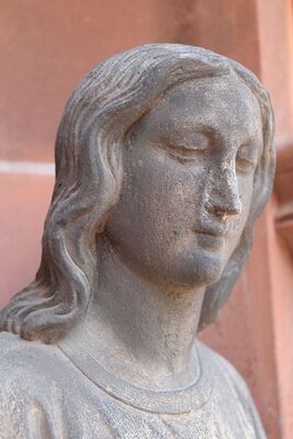 Fragment einer kleinen Plastik. Kopf eines Engels mit schulterlangem, gewelltem und in der Mitte gescheiteltem Haar. Das lange Haar an der Seite ist so nach hinten drapiert, dass der untere Teil der Ohren sichtbar ist. Der untere Teil des Kopfes ist geglättet. Die in Stein ausgeführte, vollständige Skulptur befindet sich am rechten Seiteneingang der Kirche St. Nikolaus in Bellheim.