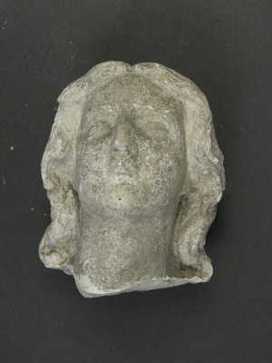 Fragment einer kleinen Plastik. Kopf eines Engels mit schulterlangem, gewelltem und in der Mitte gescheiteltem Haar. Das lange Haar an der Seite ist so nach hinten drapiert, dass der untere Teil der Ohren sichtbar ist. Der untere Teil des Kopfes ist geglättet. Die in Stein ausgeführte, vollständige Skulptur befindet sich am rechten Seiteneingang der Kirche St. Nikolaus in Bellheim.