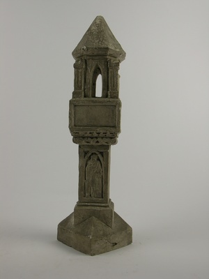 Modell eines Bildstockes, Grabmales oder Gedenksteines in Form eines Bildstockes bzw. einer Totenleuchte. Auf einer fünfeckigen Grundplatte die pyramidal nach oben zuläuft, ist eine um 45° versetzte kurze rechteckige Säule eingelassen, die wiederum Basis ist für eine sich nach oben dachförmig abgeschrägte Kämpferplatte mit geringerer Grundfläche ist und über der sich eine quadratische Säule mit noch kleinerer Grundfläche erhebt. Auf einer floral verzierten Kämpferplatte über der quadratischen Säule, sitzt ein "Würfel", der sich nach unten und oben verjüngt und dort floral verziert ist. Auf diesem Würfel erhebt sich ein Pavillion, bestehend aus vier Säulen mit quadratischen Basen an jeder Ecke. Zwischen den Säulen befinden sich gotisch anmutende Fensternischen. Auf den quadratischen Kapitellen dieser Ecksäulen ruht ein zeltförmiges, achteckiges Dach. Auf der Vorderseite des Würfels ist eine gerahmte freie Fläche zu sehen, die nach der Ausarbeitung vermutlich eine Inschrift aufnehmen soll. Die Vorderseite der längeren quadratischen Säule, unterhalb des Würfels, zeigt in einem gotisch anmutenden Rahmen ein Relief Marias mit Jesuskind. Das Gipsmodell wurde umgesetzt in Stein als Grabmal und steht auf dem Hauptfriedhof in Speyer. Das Grabmal ist signiert mit Julius Renn.