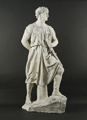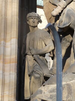 Gewandfigur eines bartlosen Häschers mit kurzem Haar. Ein Tuch ist um seinen Kopf gewickelt. Er trägt eine weite, bodenlange Tunika, die durch einen Knopf am Halsausschnitt geschlossen wird. Die Tunika mit kurzen Ärmeln ist bis zu den Knien nach oben gerafft und wird mit dem Gürtel in der Taille gehalten. Der linke Arm des Häschers ist angewinkelt. In der linken Hand hält er lose ein Kurzschwert, das mit der Klinge, die sich nach unten verbreitert, auf seinem linken Knie liegt. Der rechte Arm ist ebenfalls angewinkelt. Die rechte Hand liegt auf dem Rücken. Der Blick des Häschers ist nach links gerichtet und sein Körper dreht sich leicht in dieselbe Richtung. Sein linkes Bein steht erhöht auf einem Felsen. Das rechte Bein ist nach hinten gestreckt. Hinter dem Häscher steht ein Baumstumpf, der vermutlich der Figur Halt geben soll. Mit metallenen Messpunkten. Der Scherge steht in Stein gearbeitet auf dem Ölberg südlich des Domes zu Speyer. Gottfried Renn schuf die Figur 1856 im Auftrag des Domkapitels als Ersatz für die zerstörten spätgotischen Figuren.