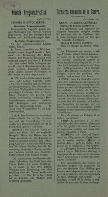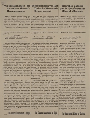 Wandanschlag in deutscher, niederländischer und französischer Sprache. Veröffentlicht im von Deutschland besetzten Belgien, ohne Datum. "Veröffentlichungen des deutschen General-Gouvernements. Berlin, 27. April. (Amtliche Meldung von heute mittag.) Westlicher Kriegsschauplatz. Südöstlich von Ypern nahmen wir englische Stellungen unter kräftiges Feuer, dessen gute Wirkung durch Patrouillen festgestellt wurde. Südlich von St. Eloi wurde ein stärkerer feindlicher Handgranatenangriff durch Feuer zum Scheitern gebracht. Im Abschnitt Givenchy-en-Gohelle - Neuville-St. Vaast sprengten wir mit Erfolg mehrere Minen, entrissen in anschliessenden Handgranatenkämpfen bei Givenchy dem Gegener ein Stück seines Grabens und wiesen Gegenangriffe ab. Englische Vorstösse nördlich der Somme blieben erfolglos. Im Maasgebiete ist es neben heftigen Artilleriekämpfen nur links des Flusses zu Infanterietätigkeit gekommen. Mit Handgranaten vorgehende französische Abteilungen wurden zurückgeschlagen. Deutsche Patrouillenunternehmungen an mehreren Stellen der Front, so in der Gegend nordöstlich von Armentières und zwischen Voilly und Craonne waren erfolgreich. Im Luftkampf wurde je ein feindliches Flugzeug bei Souchez und südlich von Tahure; durch Abwehrgeschütze ein drittes südlich von Parroy abgeschossen. Die Bahnlinie im Noblette-Tale südlich von Suippes wurde durch ein deutsches Flugzeuggeschwader ausgiebig mit Bomben belegt. Heute nacht kam ein Luftschiffangriff gegen die Hafen- und Bahnanlagen von Margate an der englischen Ostküste zur Ausführung. Oestlicher Kriegsschauplatz. Die Lage ist unverändert. Eines unserer Luftschiffe warf auf die Werke, sowie Hafen- und Bahnanlagen von Dünnmünde Bomben ab. Balkan-Kriegsschauplatz. Nichts neues. Wien, 27. April. (Amtliche Meldung von heute mittag.) Russischer und südöstlicher Kriegsschauplatz. Nichts Neues. Italienischer Kriegsschauplatz. An der küstenländischen Front waren die Artilleriekämpfe gestern und heute nach stellenweise sehr lebhaft. Am Abend setzte gegen unsere wiedergewonnenen Gräben östlich von Selz Trommelfeuer ein. Ein darauffolgender feindlicher Angriff wurde abgeschlagen. Der Monte San Michele stand am Nachmittage unter heftigem Feuer aller Kaliber. Am Tolmeiner Brückenkopf und nördlich davon wirkte unsere Artillerie kräftig gegen die italienischen Stellungen. Bei Flitsch verjagten unsere Truppen den Feind aus einem Stützpunkte im Rombongebiete und nahmen einen Teil der aus Alpinis bestehenden Besatzung gefangen. An der Tiroler Front ist die Lage unverändert. Konstantinopel, 27. April. Das Hauptquartier teilt mit: Von den verschiedenen Fronten ist nichts von Bedeutung zu melden. Das General-Gouvernement in Belgien."