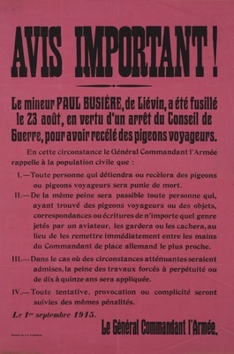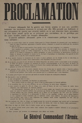Wandanschlag in französischer Sprache. Veröffentlicht im von Deutschland besetzten Gebiet im Westen (wahrscheinlich Frankreich), ohne Datum. Die Bevölkerung muss ihren deutschen Besatzern alle Waffen und Brieftauben melden. Des Weiteren wird bekanntgegeben, dass französische Soldaten sich nicht hinter der Front aufhalten dürfen und jeder, der einen solchen versteckt oder nicht meldet, wird als Komplize bestraft. "Proclamation I. - Les personnes qui possèdent des armes quelconques, soit armes à feu, soit armes blanches, des munitions ou matière explosives de toute nature, des fusées ou appareils servant à donner des signaux optiques, sont tenues de les déposer tout de suite à la Mairie. Les armes déposées doivent être munies d’une étiquette portant les nom et adresse du propriétaire. II. - Les personnes qui possèdent des pigeons-voyageurs ou pigeons de toutes autres espèces, sont tenues d’en faire la déclaration à la Mairie jusqu’à la date du 15. mars 1915. III. - Les Maires auront à certifier par écrit qu’il ne se trouve plus, sur le territoire de leurs communes, ni armes, munitions, etc., etc., autres que ceux déposées à la Mairie, ni pigeons ou pigeons-voyageurs non déclarés. Ils répondront de leur vie de la remise intégrale des armes, etc., ainsi que de l’exactitude de leurs certificats. IV. - Sera punie de mort toute personne qui, après le versement général des armes, etc., en détiendra ou on recèlera ou qui, après la date indiquée à l’art. II, détiendra des pigeons ou pigeons-voyageurs non déclarés. V. - Il est interdit aux personnes civiles de s’approcher des endroits où se déroule un combat. Toute personne qui dépouillera des soldats morts ou blessés ou qui, sans autorisation, s’occupera d’une facon quelconque des morts, sera fusillée sur-le-champ. VI. - Tout officier ou soldat ennemi rencontré sur le théâtre des opérations ou en arrière des troupes allemandes, ayant quitté son uniforme et revêtu des habits civils, sera considéré comme espion et traité comme tel. La personne qui aura fourni les dits habits ainsi que les personnes qui , ayant connu le fait, n’en n’auront pas avisé les autorités militaires, seront punies comme complices. VII. - Tout officier ou soldat ennemi rencontré en arrière des lignes allemandes et encore armée sera fusillé s’il ne se rend pas à la première sommation. VIII. - Il est strictement défendu aux populations du territoire occupé par l’armée allemande, d’entretenir des relations ou communications avec celles du territoire ennemi non encore occupé ainsi qu’avec celles des territoires neutres. Des infractions à cette prescription, à moins qu’elles ne relèvent des lois, plus sévères, contre la trahison en cas de guerre, seront punies de prison pouvant aller jusqu’à cinq ans; des cas moins graves entraineront un emprisonnement jusqu’à six semaines; dans les deux cas la saisie de biens totale ou partielle pourra être prononcée. Le Général Commandant l’Armée."