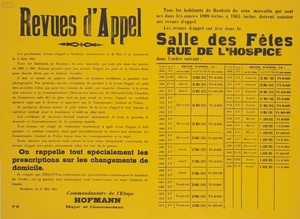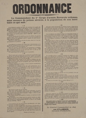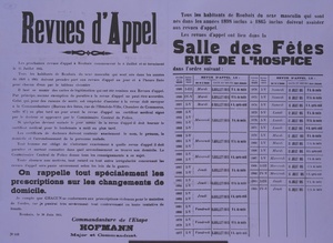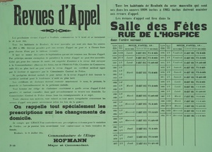 Wandanschlag in französischer Sprache. Veröffentlicht im von Deutschland besetzten Gebiet im Westen (wahrscheinlich Frankreich), ohne Datum. Zusammenfassung der Bestimmungen für die wehrpflichtigen Männer, die sich einschreiben müssen, und die Jugendlichen zwischen 17 und 21 Jahren, die sich wöchentlich melden müssen. "Résumé des Règlements concernant les Mobilisables 1. Tous les hommes de 17 à 50 ans sont considérés comme mobilisables et doivent être inscrits sur les listes de leurs communes. A la Mairie chaque inscrit entre en possession d’un certificat d’inscription portant son numéro d’inscription et adresse exacte. Ce certificat doit, comme la carte d’identité, être toujours en possession du bénéficiaire. 2. Celui qui n’a pas encore atteint l’âge réglementaire est tenu de se faire inscrire dans le courant du mois où ses 17 ans sont révolus. Quiconque ne se conformerait pas à ce règlement encourrait des peines très sévères. 3. Un mobilisable ne peut s’établir dans une autre commune, qu’après autorisation accordée par le Commandant de place. Quiconque séjourne dans une commune, pour un laps de temps supérieur à huit jours, est tenu de se conformer au règlement d’inscription et de se présenter à la Mairie dans les 24 heures. 4. Tous les jeunes gens de 17 à 21 ans, y compris la classe de 1914, doivent être présents à l’heure fixée pour la revue d’appel hebdomadaire ayant lieu dans leurs communes. La plus grande exactitude est exigée. On ne peut être libéré de ces revues que par le Commandant. 5. Quiconque ne pourrait, à cause de son travail pour une autorité militaire allemande, faire acte de présence à une revue d’appel, ne serait considéré comme valablement excusé qu’en cas où son bureau de travail ferait parvenir au Commandant de place, pendant la revue d’appel, un certificat justifiant son absence. Ce certificat n’aura de valeur que pour une seule revue et devra être renouvelé pour chaque cas particulier. 6. Dans le cas où un mobilisable quitterait sa commune pour un temps prolongé, sans autorisation du Commandant de place, la commune, les parents ou patrons, responsables du disparu, auraient à répondre de lui devant l’Autorité militaire allemande et pourraient être reconnus passibles des peines citées dans l’article 8 de cette proclamation. 7. Ses 17 ans révolus le mobilisable doit, sitôt son inscription faite, se présenter au bureau du Commandant, où son certificat d’inscription sera visé et timbré. De même les certifacts d’inscription de tous les mobilisables tenus de prendre part aux revues d’appel (jeunes gens de 17 à 21 ans inclusivement), devront être visés et timbrés. Celui qui, après cette date, sera surpris avec un certificat ne portant pas le timbre réglementaire, sera puni. 8. Ces règlements sont indépendants des arrêtés concernant les listes de domicile et les cartes d’identité. Toute infraction à ces prescriptions pourra être punie d’une amende de 100 à 1,000 Mark et d’une peine d’emprisonnement d’un mois à un an, à moins qu’elle ne relève de peines plus graves encore. Le Commandant de Place"