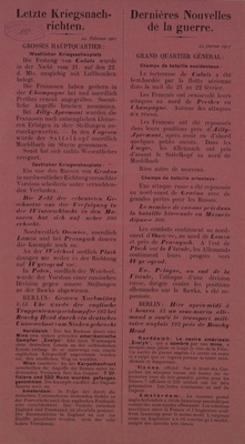 Wandanschlag in deutscher und französischer Sprache. Veröffentlicht im von Deutschland besetzten Gebiet im Westen (wahrscheinlich Frankreich, da zweisprachig), 1. Februar 1915. "Neueste Kriegsnachrichten. 1. Februar 1915 Grosses Hauptquartier: Westlicher Kriegsschauplatz: In Flandern fanden gestern nur Artilleriekaempfe statt. Bei Cuinchy, suedlich der Strasse La Bassée-Béthune, sowie bei Carency [nordwestlich Arras], wurden den Franzosen einige Schuetzengraeben genommen. Oestlicher Kriegsschauplatz: Von der ostpreussischen Grenze nichts Neues. In Polen wurde bei Bolymow, oestlich Lovicz, ein russischer Angriff abgeschlagen. London [Reuter]: Das deutsche Unterseeboot U 21 versenkte Sonntag frueh den Kuestendampfer ’Benoruan’ durch einen Torpedoschuss. Dasselbe Tauchboot fing gegen Mittag den Dampfer ’Linda Blancha’ auf der Fahrt nach Manchester ab. Ein in Liverpool eingetroffener Dampfer berichtet, es sei beobachtet worden, wie das U.-Boot noch einen dritten Dampfer vernichtete. Times: Kairo: Ein franzoesischer Flieger und ein englischer Beobachter, die auf einem Aufklaerungsflug oestlich des Suezkanals ihr Flugzeug verloren hatten, wurden von eigenen Posten erschossen, als sie zu Fuss zurueckkehrten. Daily Telegraph: Kalkutta: In Ferospur fand eine Verhandlung gegen mehrere Sikhs statt, die sich an den Vorbereitungen fuer eine Revolution in Indien beteiligt hatten. Wien [amtlich]: Am Dunajec und an der Nida herrschte gestern auf beiden Seiten lebhafte Artillerietaetigkeit. Der Feind raeumte unter heftigem Feuer einige Schuetzengraeben. Auch an der uebrigen Front in Russisch-Polen fand zeitweise Geschuetzkampf statt. In den Karpathen verlief der Tag ruhiger. Paris [amtlich]: Ein deutsches Unterseeboot versenkte am Sonnabend vormittag den englischen Dampfer ’Takomaru’. Ein deutsches Unterseeboot beschoss nachmittags in denselben Gewaessern den englischen Dampfer ’Ikaria’. Matin: Nancy: Der Prefekt des Departements Meurthe et Moselle suspendierte den Buergermeister des groesseren Gemeindebezirks Nancy fuer 15 Tage vom Amte."