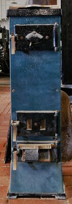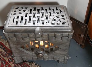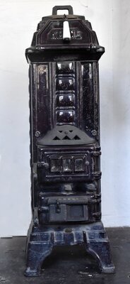 Der Kochofen, Leuchtofen und Regulierofen ist im Stil des Art déco gestaltet. Unter dem kunstvollen Deckel befindet sich die Kochplatte mit 2 möglichen Stellen zum Einhängen von Kochtöpfen. An der rechten Seite des Ofens befindet sich ein Türchen zur Feuerkammer und - darunter - zum Aschekasten. Mit einem Drehknopf an der Vorderseite unter den Glimmerscheiben kann die Luftzufuhr reguliert werden. Das Abluftrohr ist oben auf der Rückseite des Ofens. Das Freilichtmuseum Roscheider Hof besitzt mehrere Leuchtöfen mit mehr oder weniger großen Glimmerscheiben. Der hier beschriebene Ofen besitzt 14 Glimmerscheiben an der Vorderseite des Ofens vor der Brennkammer und dem darunter liegenden Aschefach. Bei unserem Foto wurde das Licht im Ofen nicht durch ein Feuer im Inneren, sondern durch eine kleine Videoleuchte in der Brennkammer erzeugt. Er ist wie fast alle Leuchtöfen ein Dauerbrandofen des amerikanischen Typs.