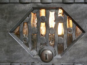 Der Kochofen, Leuchtofen und Regulierofen ist im Stil des Art déco gestaltet. Unter dem kunstvollen Deckel befindet sich die Kochplatte mit 2 möglichen Stellen zum Einhängen von Kochtöpfen. An der rechten Seite des Ofens befindet sich ein Türchen zur Feuerkammer und - darunter - zum Aschekasten. Mit einem Drehknopf an der Vorderseite unter den Glimmerscheiben kann die Luftzufuhr reguliert werden. Das Abluftrohr ist oben auf der Rückseite des Ofens. Das Freilichtmuseum Roscheider Hof besitzt mehrere Leuchtöfen mit mehr oder weniger großen Glimmerscheiben. Der hier beschriebene Ofen besitzt 14 Glimmerscheiben an der Vorderseite des Ofens vor der Brennkammer und dem darunter liegenden Aschefach. Bei unserem Foto wurde das Licht im Ofen nicht durch ein Feuer im Inneren, sondern durch eine kleine Videoleuchte in der Brennkammer erzeugt. Er ist wie fast alle Leuchtöfen ein Dauerbrandofen des amerikanischen Typs.