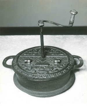 Schwarzweiß Fotografie zeigt den alten Schützenplatz, der von 1950 bis 1974 genutzt wurde. der befand sich neben der Einfahrt zum Haus im Peterstal. Aufgenommen wurde das Bild über einen Garten hinweg und zeigt den mit Fahne und Wimpel geschmückten Platz.