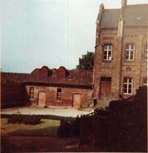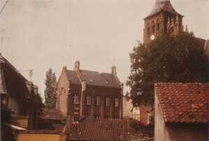 Zwei Schwarzweiß- und drei Buntfotografien der alten Volkschule neben der Kirche.