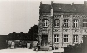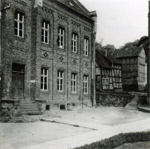 Zwei Schwarzweiß- und drei Buntfotografien der alten Volkschule neben der Kirche.