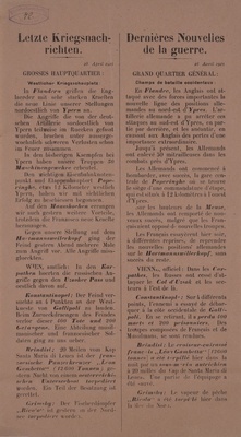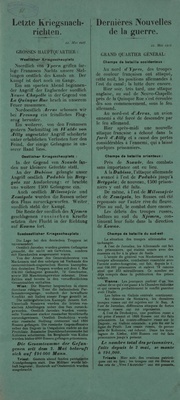 Wandanschlag in deutscher und französischer Sprache. Veröffentlicht im von Deutschland besetzten Gebiet im Westen (wahrscheinlich Frankreich, da zweisprachig), 15. Januar 1915. "Letzte Kriegsnachrichten. 15. Januar 1915 Grosses Hauptquartier: In den Duenen bei Nieuport und suedoestlich Ypern fand gestern ein heftiger Artilleriekampf statt. In Fortsetzung des Angriffs vom 12. Januar nordoestlich Soissons griffen die Deutschen erneut an und nahmen die Hoehenstellungen noerdlich und nordoestlich Soissons sowie die Doerfer im Aisnetal Grouy und Bucy le-Long. Bisher sind 3300 Gefangene gemacht und 2 Feld- u. 40 schwere Geschuetze erobert worden. Der Feind befindet sich im Rueckzug ueber die Aisne nach dem Sueden. Nordoestlich des Lagers von Chalons griffen die Franzosen gestern Vor- und Nachmittag mit starken Kraeften oestlich Perthes wieder an. Sie wurden zurueckgeworfen und liessen 160 Gefangene in unseren Haenden. In den Argonnen und in den Vogesen nichts von Bedeutung. Oestlicher Kriegsschauplatz: Suedoestlich Gumbinnen und oestlich Loetzen sind russische Angriffe abgeschlagen worden, wobei mehrere Hundert Gefangene gemacht wurden. Im noerdlichen Polen ist die Lage unveraendert. In Polen westlich der Weichsel wurden unsere Angriffe fortgesetzt. Auf dem oestlichen Piliza-Ufer ereignete sich nichts Besonderes. Wien (amtlich): In Westgalizien und Russisch-Polen verlief der gestrige Tag allgemein ruhig. Laengs der Nida scheiterten alle russischen Angriffe. In den Ostkarpathen und suedlichen Bukowina fanden neuerdings unbedeutende Rekognoszierungsgefechte statt."