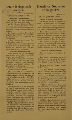 Wandanschlag in deutscher und französischer Sprache. Veröffentlicht im von Deutschland besetzten Gebiet im Westen (wahrscheinlich Frankreich, da zweisprachig), 11./12. Dezember 1914. "Letzte Kriegsnachrichten. 11. Dezember Grosses Hauptquartier: Heftiges Artilleriefeuer der Franzosen gestern bei Jonain. Ein am oestlichen Argonnenwalde auf Rocroi-Evureuilles erneuter Angriff kam nicht vorwaerts. Er erstarb in unserem Artilleriefeuer, das dem Gegner augenscheinlich groessere Verluste beibrachte. 3 feindliche Flieger warfen gestern auf Freiburg i. Br. 10 Bomben herab, die keinen Schaden anrichteten. Wir erwaehnen den Vorfall nur, da sein Beginn des Krieges schon haeufig offene Staedte abseits des Operationsgebietes vom Feinde mit Bomben beworfen worden sind. Oestlich der masurischen Suempfe fanden nur Artilleriekaempfe statt. - In Nordpolen nahm auf dem rechten Weichselufer eine unserer dort vorgehenden Kolonnen Srzasnysz im Sturm und erbeutete einige Maschinengewehre und 600 Gefangene. - In Suedpolen wurden russische Angriffe abgewiesen. Wien: (amtlich). Ein Teil unserer Truppen in Serbien stiess westlich Milanowae auf starke feindliche Kraefte; um dem Gegenstoss auszuweichen, wurden einzelne Teile in guenstigere Abschnitte befohlen. Suedlich Belgrad schreitet unsere Offensive vorwaerts. Am 8. Dezember wurden insgesamt 20 Geschuetze und 1 Scheinwerfer und eine Anzahl Gefangene gemacht. Wien: (amtlich). In Westgalizien kaempfen starke Kraefte auf beiden Seiten. Bisher wurden 10 000 Russen gefangen. Konstantinopel: (amtlich) Russischer Landungsversuch in Goma, suedlich Batum, unter Schutz der Kriegsschiffe abgeschlagen. 2 Geschuetze erobert. Im Wilajet WAn russische Angriffe abgeschlagen. Den 12. Dez. 1914. Grosses Hauptquartier: Fortschritte in Flandern, im Osten und Westen der Argonnen sowie in Nordpolen. Franzoesische Angriffe im Bois de Pêtre, westlich von Pont-à-Mousson, wurden abgewiesen. Wien: (amtlich) In der Schlacht in Galizien ist noch keine Entscheidung gefallen. Russische Angriffe wurden unter schweren Verlusten fuer den Feind abgeschlagen. In Polen Ruhe. Przemysl ist eingeschlossen aber nicht angegriffen. Besatzung macht taeglich mehr oder weniger grosse Ausfaelle."