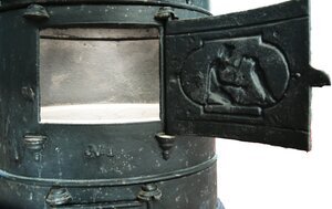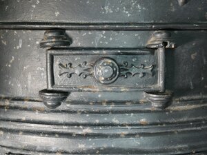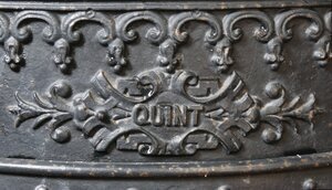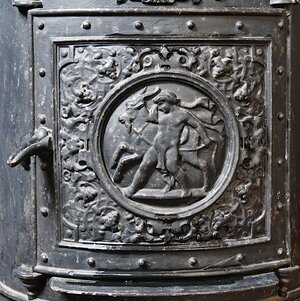 Der Ofen ist vom Typ des ovalen Wormser Ofens, der auch ab ca 1870 gefertigt wurde. Hinter der oberen Tür und ganz oben befinden sich im Boden Ofenringe, die zum Einhängen von Kochtöpfen herausgenommen werden konnten. Die Abbildungen auf den beiden Türen zeugen vom gehobenen humanistischen Bildungsstand seines Besitzers. Die obere Tür zeigt einen Faun (oder den griechischen Gott Pan) zusammen mit einer Ziege, eingerahmt von Grotesken im Stil der Neorenaissance. Auf der Tür darunter ist dargestellt wie Ganymed als Mundschenk den als Adler dargestellten Göttervater Zeus bedient. Die Klappe zu Brennkammer und die Front des Aschekastens sind mit Ornamenten verziert. Im Boden des Raums hinter der Klappe mit dem Faun und ganz oben auf dem Ofen befinden sich Ofenringe. Der Ofen steht auf Klauenfüßen. Hergestellt wurde der Ofen von der Eisenhütte in Quint (heute ein Stadtteil von Trier). Diese wurde 1683 gegründet und entwickelte sich im Laufe der Zeit zu einem bedeutenden Unternehmen. Sie betrieb von 1857 bis 1891 bei Schweich ein eigenes Eisenbergwerk. Nach mehrfachem Besitzerwechsel kommt das Unternehmen zum Klöckner-Konzern, der 1925 das Walzwerk stilllegt und zum 31.1.1972 diesen Unternehmensteil ganz aufgibt. Quint-Öfen wurden von Ende des 17. Jahrhunderts bis 1960 hergestellt. Heute (2021) sind nur noch das Schloss des Hüttenherrn und einige Verwaltungsgebäude erhalten.