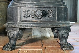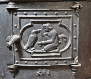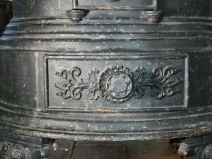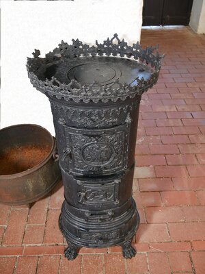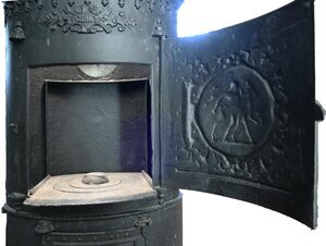 Der Ofen ist vom Typ des ovalen Wormser Ofens, der auch ab ca 1870 gefertigt wurde. Hinter der oberen Tür und ganz oben befinden sich im Boden Ofenringe, die zum Einhängen von Kochtöpfen herausgenommen werden konnten. Die Abbildungen auf den beiden Türen zeugen vom gehobenen humanistischen Bildungsstand seines Besitzers. Die obere Tür zeigt einen Faun (oder den griechischen Gott Pan) zusammen mit einer Ziege, eingerahmt von Grotesken im Stil der Neorenaissance. Auf der Tür darunter ist dargestellt wie Ganymed als Mundschenk den als Adler dargestellten Göttervater Zeus bedient. Die Klappe zu Brennkammer und die Front des Aschekastens sind mit Ornamenten verziert. Im Boden des Raums hinter der Klappe mit dem Faun und ganz oben auf dem Ofen befinden sich Ofenringe. Der Ofen steht auf Klauenfüßen. Hergestellt wurde der Ofen von der Eisenhütte in Quint (heute ein Stadtteil von Trier). Diese wurde 1683 gegründet und entwickelte sich im Laufe der Zeit zu einem bedeutenden Unternehmen. Sie betrieb von 1857 bis 1891 bei Schweich ein eigenes Eisenbergwerk. Nach mehrfachem Besitzerwechsel kommt das Unternehmen zum Klöckner-Konzern, der 1925 das Walzwerk stilllegt und zum 31.1.1972 diesen Unternehmensteil ganz aufgibt. Quint-Öfen wurden von Ende des 17. Jahrhunderts bis 1960 hergestellt. Heute (2021) sind nur noch das Schloss des Hüttenherrn und einige Verwaltungsgebäude erhalten.