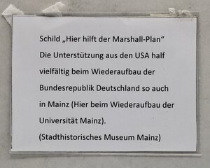 Das Schild fungierte als Zusatz-Bauschild und wurde an allen durch den Marshallplan finanzierten Baumaßnahmen und Investitionen montiert. Seit 1948 erhielt Westdeutschland, später dann die Bundesrepublik Deutschland, Kredite in Höhe von 1,5 Milliarden US-Dollar, von denen nach dem Londoner Schuldenabkommen nur 1 Milliarde Dollar zurückgezahlt werden mussten. Gezeigt wird neben dem Text ein Logo mit den Insignien der US-Fahne und der Aufschrift "Zur Stärkung der freien Welt". Mit diesem Slogan kam die weltpolitische Absicht der amerikanischen Regierung zum Ausdruck: Die freie Welt im Gegensatz zum gleichmachenden, kommunistischen Einheitsregime. Dieses Schild hing an einer Maßnahme zum Aufbau der Mainzer Universität.