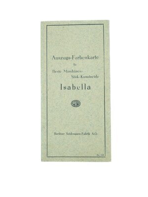 Eine Karte mit Farbproben von Stick-Kunstseiden für Besle Maschinen der Berliner Seidengarn-Fabrik A.G. Diese Farbauswahl trägt den Namen Isabella. Im Inneren der Karte sind mit Kunstseiden-Stickgarn 52 Farbproben eingestickt und aufgelistet, jeweils mit einer Farbnummer versehen. Solche Farbkarten war für einen Betrieb, der mit Textilien zu tun hatte, unerlässlich, da auf diese Weise Farb- und Qualitätsbeschaffenheit von Garnen und Textilien übersichtlich dargestellt und anhand dessen bestellt oder nachbestellt werden konnte. Auch konnte in diesem Fall die Kurbelstickerin Katharina Meurer auf diese Weise immer nachsehen, wie die Farbtöne der letzten Bestellung geheißen hatten und mit welcher Maschine diese kompatibel waren. Da es sich bei dem Garn um Kunstseide handelte, nahm die gewerbliche Kurbelstickerin diese wohl aus praktischen und wirtschaftlichen Gründen zur Hand. Kunstseidengarn besteht aus Cellulose-Verbindungen und wurde seit den 1920er-Jahren massengefertigt. Damit stellte es eine günstige Alternative zum echten Seidengarn dar, welches in der Produktion höchst zeitaufwendig, resourcenintensiv und dementsprechend teuer war, ganz zu schweigen von der notwendigen Aufzucht und Tötung der hierzu benötigten Seidenspinnerraupen. In der Qualität unterschied sich echtes Seidengarn besonders in Stickereien optisch und haptisch wenig vom künstlichen, weshalb es sich in der Textilindustrie großer Beliebtheit erfreute und auch dem weniger gut verdienenden Bevölkerungsteil einen Zugang zu modisch verzierter Kleidung bot.