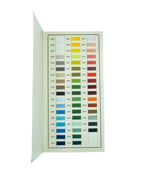 Eine Karte mit Farbproben von Stick-Kunstseiden für Besle Maschinen der Berliner Seidengarn-Fabrik A.G. Diese Farbauswahl trägt den Namen Isabella. Im Inneren der Karte sind mit Kunstseiden-Stickgarn 52 Farbproben eingestickt und aufgelistet, jeweils mit einer Farbnummer versehen. Solche Farbkarten war für einen Betrieb, der mit Textilien zu tun hatte, unerlässlich, da auf diese Weise Farb- und Qualitätsbeschaffenheit von Garnen und Textilien übersichtlich dargestellt und anhand dessen bestellt oder nachbestellt werden konnte. Auch konnte in diesem Fall die Kurbelstickerin Katharina Meurer auf diese Weise immer nachsehen, wie die Farbtöne der letzten Bestellung geheißen hatten und mit welcher Maschine diese kompatibel waren. Da es sich bei dem Garn um Kunstseide handelte, nahm die gewerbliche Kurbelstickerin diese wohl aus praktischen und wirtschaftlichen Gründen zur Hand. Kunstseidengarn besteht aus Cellulose-Verbindungen und wurde seit den 1920er-Jahren massengefertigt. Damit stellte es eine günstige Alternative zum echten Seidengarn dar, welches in der Produktion höchst zeitaufwendig, resourcenintensiv und dementsprechend teuer war, ganz zu schweigen von der notwendigen Aufzucht und Tötung der hierzu benötigten Seidenspinnerraupen. In der Qualität unterschied sich echtes Seidengarn besonders in Stickereien optisch und haptisch wenig vom künstlichen, weshalb es sich in der Textilindustrie großer Beliebtheit erfreute und auch dem weniger gut verdienenden Bevölkerungsteil einen Zugang zu modisch verzierter Kleidung bot.