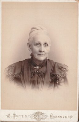 Das hell vignettierte Brustportrait einer älteren Dame, die schräg am Betrachter vorbei sieht. Ihr weißes Haar ist glattgestrichen und hochgesteckt. Die hochgeschlossene Bluse ist mit aufwändigen Perlenstickereiapplikationen auf der Brust und an den Schultervolants, sowie einer Schnalle oder Brosche am Kragen verziert. Der niedrige Stehkragen wird außerdem von einer hellen Spitzenborte geschmückt. Der Stoff der Bluse ist vertikal zur Brustmitte hin eng, zu den Schultern hin weiter gerafft. Die Menge an Raffungen und damit verbrauchtem Stoff, sowie die Perlenstickereien implizieren den finanziellen Wohlstand der Trägerin. Der goldenen Unterschrift mit Initialen und der goldenen Schrift auf der Rückseite der Fotografie ist zu entnehmen, dass sie im Atelier Carl Thies in Hannover gefertigt wurde. Ebenfalls auf der Rückseite ist ein Hinweis auf die Aufbewahrung der Platte für Nachdrucke vermerkt. In Handschrift ist auf der Rückseite von einem Nachfahren festgehalten, wer die Frau war.