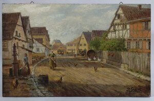 Das Ölgemälde, auf einer ein Zentimeter Holzplatte gemalt, von Peter Greeff (1965-1939) zeigt eine lebende Dorfszene mit Fachwerkhäusern und verputzen Häusern. Eine Trinkwasserpumpe, wie sie in allen Orten des Beginnenden 20. Jahrhundert die Haushalte mit Trinkwasser versorgten, in Bodendorf standen damals 48 am Straßenrand oder standen bei begüterten Bewohnern im Hof, findet man links vorn im Bild. Ebenso Personen, Hühner und Gänze auf der Dorfstraße und ein Ochsengespann, welches aus dem Hintergrund auf den Maler zu kommt. Ein in der Mitte des Bildes liegendes großes Weinfass am Straßenrand könnte auf einen Weinort hinweisen, in dem das Gemälde entstanden ist.