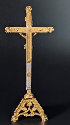 Kleines Hochkreuz im Dreinageltyp. Alle 4 Enden des Kreuzes sind mit einer Jakobsmuschel geschmückt. Über dem Korpus hängt schräg die Tafel mit der INRI Inschrift. Die Vergoldung ist insbesondere au Vor- und Rückseite des Längsbalkens abgängig. Das Kreuz steht auf einem dreieckigen Ständer. Die Füße ähneln Löwenpfoten, Die Seiten sind mit Eichenlaubornamenten geschmückt. Teil einer zu einem Kinderaltar gehörender Sammlung litugischer Geräte im Miniaturformat.