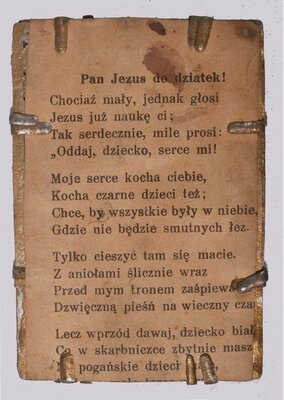 Andachtsbild in einem mit einem vergoldeten Zinkdruckgussrahmen. Dargestellt ist das segnende Jesuskind mit Heiligenschein. Es trägt eine weiße Tunika und einen roten Mantel. Farblithographie auf Papier. Auf der Rückseite befibdet sich ein Gebet in polnischer Sprache. Das Bildchen wurde so beschnitten, dass es in den bereits vorhandenen Rahmen passte. Das letzte Bild (Internetfund) zeigt das Bild in seiner ursprünglichen Größe. Das Exemplar aus dem Südtiroler Landesmuseum für Volkskunde besitzt unter dem Bild noch den Text "Wer mich liebt, der wird von meinem Vater geliebt werden" und auf Rückseite ein deutschsprachiges Gebet,