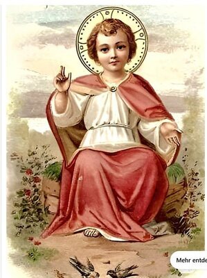 Andachtsbild in einem mit einem vergoldeten Zinkdruckgussrahmen. Dargestellt ist das segnende Jesuskind mit Heiligenschein. Es trägt eine weiße Tunika und einen roten Mantel. Farblithographie auf Papier. Auf der Rückseite befibdet sich ein Gebet in polnischer Sprache. Das Bildchen wurde so beschnitten, dass es in den bereits vorhandenen Rahmen passte. Das letzte Bild (Internetfund) zeigt das Bild in seiner ursprünglichen Größe. Das Exemplar aus dem Südtiroler Landesmuseum für Volkskunde besitzt unter dem Bild noch den Text "Wer mich liebt, der wird von meinem Vater geliebt werden" und auf Rückseite ein deutschsprachiges Gebet,