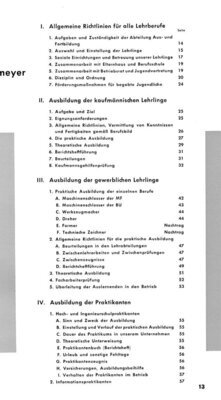 Auf insgesamt 60 DIN A 4 Seiten präsentiert sich das Unternehmen Zettelmeyer in Konz, als moderner, sozialer Ausbildungsbetrieb. Der Einstieg in die Broschüre erfolgt über einen kleinen Einblick in die Firmengeschichte mit der aktuellen Gliederung des Betriebes, ihren Führungskräfte bis zum breitgefächertem Ausbildungsangebot unterschiedlicher Berufe. Ausgebildet werden Lehrlinge in kaufmännischen und handwerklichen Berufen, sowie Praktikanten. Sparten übergreifend sind allgemeine Richtlinien genannt, wie die Auswahl und Einstellung der Lehrlinge, Soziale Einrichtungen und Betreuung, die Zusammenarbeit mit Elternhaus und Berufsschule, Disziplin und Ordnung in der Betriebsgemeinschaft und Fördermaßnahmen für begabte Jugendliche.Es folgen Angaben und Informationen zu den speziellen Ausbildungsbereichen bis hin zum Stoffplan für die für theoretischen Ausbildungen bis hin zum entsprechendem Abschluss.