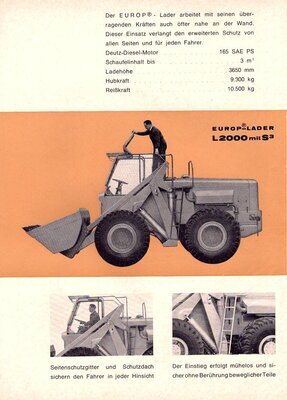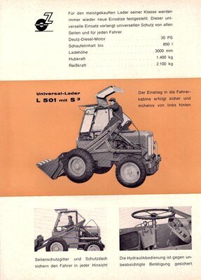 In diesem 4 Seitigen DIN A4 Faltblatt bewirbt das Unterehmen Zettelmeyer in Konz Sicherheitszubör für die Radlader Typen L 501 und L2000. Dabei geht es primär um den Schutz des Fahrzeugführers in der Fahrerkabine, den gefahrlosen Einstieg in das Gerät sowie die Sicherung gegen unbeabsichtigte Bedienung der Hydraulik. Entworfen wurde das Werbeblatt -ohne die letzte Seite- von dem Industriegrafiker Erich Prinz aus Trier. Die Broschüre wurde gegen eine Schutzgeführ dem Kunden zugestellt. Wieviele Exemplare gedruckt wurden ist unbekannt. Im Hof unseres Museums steht der Radlder Zettelmeyer L 501 mit der beworbenen Sicherheitseinrichtung. (Siehe auch Link )