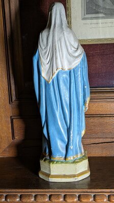 Gipsfigur mit der Darstellung des unbefleckten Herzens Marias. Die Statue steht auf einem grauen Sockel. Maria trägt ein weißes Kopftuch, eine ebenfalls weiße Tunika und über dieser einen Mantel mit außen blauer und innen rosa Farbe. Auf ihrer Brust befindet sich ein rotes brennendes mit einem Dolch durchstoßenes Herz in einem goldenen Strahlenkranz. Oben schlagen goldene Flammen aus dem Herz. Darüber befindet sich ein ebenfalls goldfarbenes Kreuz. Maria steht auf einer grünen Wiese auf einem achteckigen grauen Sockel. Die Herz-Mariä-Verehrung richtet sich auf Maria, die Mutter Jesu, als Person, die sich Gott und den Menschen widmete und dem Heilswerk ihres Sohnes unterordnete. Die Herz-Maria-Verehrung geht bis auf die Kirchenväter zurück und kam insbesondere im 17. und im 19. Jahrhundert zusammen mit der Verehrung des Herzen Jesu zur Blüte.