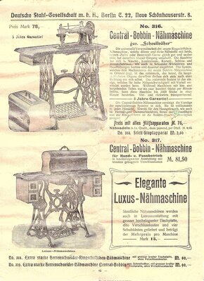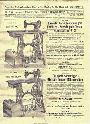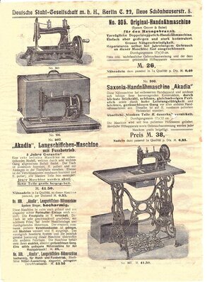 Die "Deutsche Stahl-Gesellschaft mbH" , Berlin hat um 1900 einen Katalog herausgebracht für im Hausgebrauch. Auf 116 Seiten werden Artikel angeboten von Fahrräder, über Gaskocher bis hin zu Waschmaschinen, Schaukelstühle und Nähmaschinen. Einige Fragmenten des Katalogs sind in unserem Museum erhalten geblieben. Es handelt es sich um 3 (herausgerissene) Seiten auf denen unterschiedliche Nähmaschinen mit Beschreibung und Preisen angeboten werden. Darunter befinden sich Nähmaschinen der Firmen Grover und Baker, das Modell Saxonia, oder das Modell Central Bobbin, von der Österreichischen Fabrik Rast und Gasser. Es war damals durchaus üblich den Mehrbedarf , speziell für Vertriebsfirmen, extern produzieren zu lassen. So Z.Bsp. bei der Firma OPEL aus Rüsselsheim, die nicht nur Nähmaschine der eigenen Marke OPELoder Saxonia herstellte, sondern auch für viele bekannte Firmen in deren Auftrag produzierte. So auch die oben erwähnte Maschine "Central Bobbin" oder das Modell Saxonia.