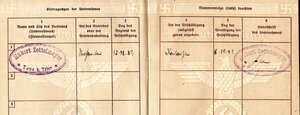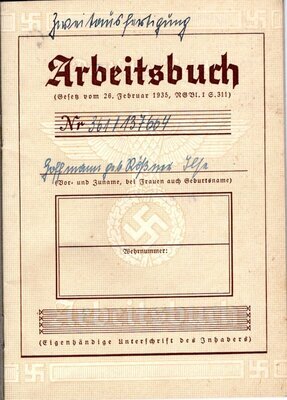 Das Arbeitsbuch war ein, von staatlichen Stellen ausgestelltes Dokument, das einem Arbeitgeber bei der Einstellung verpflichtend vorzulegen war. Ziel war es, die berufliche Mobilität von Arbeitnehmern zu kontrollieren und von der Zusage durch den früheren Arbeitgeber abhängig zu machen. (Wikipedia) Das Arbeitsbuch, der in Heidelberg geborene Ilse Hoffmann, geb. Rösner, diente zu Vorlage bei der Firma Hubert Zettelmeyer, in Konz, bei der sie sich als Kontoristin beworben hat. Demnach hat sie am 12.12.1939 dort ihre Arbeit begonnen. Das vorliegende Arbeitsbuch ist eine am 10.10.1944 ausgestellte Zweitausfertigung. Weitere Eintragungen gibt es nicht.