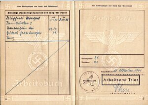 Das Arbeitsbuch war ein, von staatlichen Stellen ausgestelltes Dokument, das einem Arbeitgeber bei der Einstellung verpflichtend vorzulegen war. Ziel war es, die berufliche Mobilität von Arbeitnehmern zu kontrollieren und von der Zusage durch den früheren Arbeitgeber abhängig zu machen. (Wikipedia) Das Arbeitsbuch, der in Heidelberg geborene Ilse Hoffmann, geb. Rösner, diente zu Vorlage bei der Firma Hubert Zettelmeyer, in Konz, bei der sie sich als Kontoristin beworben hat. Demnach hat sie am 12.12.1939 dort ihre Arbeit begonnen. Das vorliegende Arbeitsbuch ist eine am 10.10.1944 ausgestellte Zweitausfertigung. Weitere Eintragungen gibt es nicht.
