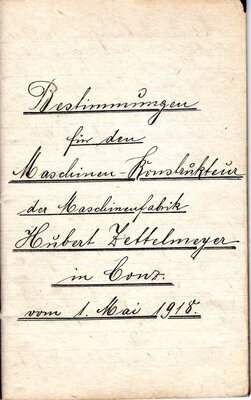 Am 1. Mai 1918 hat ein Konstrukteur der Maschinenfabrik Hubert Zettelmeyer in einem DIN A 6 Notizbuch die wichtigsten Verhaltensregeln eine Konstrukteurs festgehalten. So schreibt er handschriftlich unter Punkt 3 „Bei der Neuanfertigung von Zeichnungen, sowie bei allen Ergänzungszeichnungen der bereits bestehenden Zeichnungen, hat er dafür zu sorgen, daß alle vorgesehenen. Änderungen oder Verbesserungen auch berücksichtigt werden.“ Nach 10 Eintragungen auf 6 Seiten enden die Eintragungen. Herstellung: (unbekannt) (unbekannter Herr)
