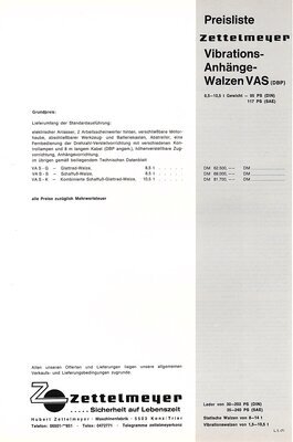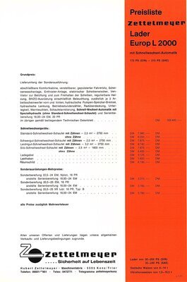 Aus dem Jahr 1971 sind Original Preislisten verschiedener Maschinen der Firma Zettelmeyer erhalten geblieben. Neben dem Grundpreis sind die Aufschläge für Zubehör und Sonderausstattungen abgegeben. Auf insgesamt 20 DIN A4 Seiten sind die unterschiedlichsten Maschinen Typen enthalten. Dazu gehören u.a. der Lader Europ L 500, Lader L 800, Lader L 1000, Lader L 1500, Lader L 2000 aber auch die Vibrations-Tandemwalze VTL, VTM und VT 7. Hinzu kommen noch die Preislisten der Zettelmeyer Vibrationsanhänge- Walz VA 3, die Vibrationsabhängewalze VAM und die Größte VAS mit10.5 to. Gewicht. Die Serie der 3 Rad-Walzen Europ S 8, S 10 und S 12 sind auf einer Preisliste zusammengefasst.