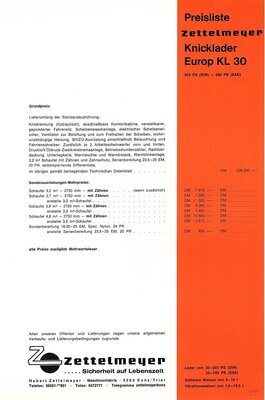 Aus dem Jahr 1971 sind Original Preislisten verschiedener Maschinen der Firma Zettelmeyer erhalten geblieben. Neben dem Grundpreis sind die Aufschläge für Zubehör und Sonderausstattungen abgegeben. Auf insgesamt 20 DIN A4 Seiten sind die unterschiedlichsten Maschinen Typen enthalten. Dazu gehören u.a. der Lader Europ L 500, Lader L 800, Lader L 1000, Lader L 1500, Lader L 2000 aber auch die Vibrations-Tandemwalze VTL, VTM und VT 7. Hinzu kommen noch die Preislisten der Zettelmeyer Vibrationsanhänge- Walz VA 3, die Vibrationsabhängewalze VAM und die Größte VAS mit10.5 to. Gewicht. Die Serie der 3 Rad-Walzen Europ S 8, S 10 und S 12 sind auf einer Preisliste zusammengefasst.