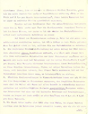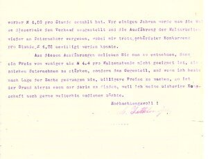 In seinem Schreiben vom 25. Febr. 1910 an den Bürgermeister von Schönecken, geht es um das geschäftsschädigende Verhalten eines ehemaligen Mitarbeiters der Firma Zettelmeyer, einem Herrn Reis. Mit seinem internen Preis-Wissen bewarb er sich bei Konkurenz und bekam dort eine Anstellung. Das Arbeitsverhältnis hielt nicht lange und Reis war bald arbeitslos. Einige Wochen später bat er Herrn Hubert Zettelmeyer, bei allen Schwüren, nie mehr gegen die Firma zu arbeiten, wenn er ihn nur wieder beschäftigte. Herr Zettelmeyer glaubte ihm. Aber das Versprechen hielt nicht lange. Reis ließ die Firma erneut sitzen, machte sich selbständig und versuchte nun mit einer äußerst aggresiven Preispolitik seinem ehemaligen Arbeitgeber die Kunden abzujagen. Den gesamten Vorgang schildert Hubert Zettelmeyer, dem Bürgermeister von Schönecken in diesem Brief. Er wirbt um Verständnis für die eigene Preisstellung, da er auf den aggresiven Wettbewerbspreis nicht eingehen kann. Eine kostendeckende Kalkulation ist damit nicht möglich und Herr Reis, der Angebotspreis nicht durch Kalkulation errechnet hat, sondern durch unmoralisches Verhalten und Absichten zustande gekommen ist. Der Brief enthält noch die Original Unterschft des Hubert Zettelmeyer