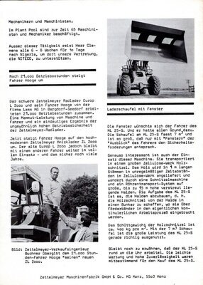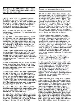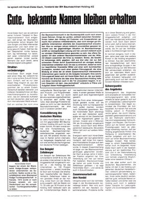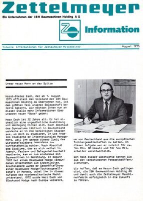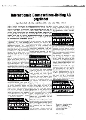 Am 1. August 1975 veröffentlicht die Allgemeine Bauzeitung einen Artikel über die Veränderungen bei den deutschen Baumaschinen Herstellern. Klein- und Mittelbetriebe kämpfen um ihre Existenz. Horst Dieter Esch will dem entgegen wirken, und gründet dafür die "Internationale Baumaschinen-Holding AG. - kurz IBH. Das Traditionsunternehmen Zettelmeyer aus Konz ist das erste Unternehmen das er aufkauft. In einem Interview mit dem bau-Zentralblatt 15/1975 berichte Host Dieter Esch über seine Pläne wie er die Konsolidierung im Baumaschienen Markt voran treiben möchte. Es gelang ihm auch, zunächst.... "Mit einem Konzernumsatz von 783,6 Mio. DM und 7180 Beschäftigten gehörte IBH im Jahre 1980 zu den zehn größten Baumaschinenkonzernen der Welt" (aus Wikipedia-siehe Link) 1983, inzwischen drittgrößter Hersteller, kam die Pleite. (siehe Link) Zeitgleich, im August 1975, erscheint das neue Betriebsinterne Informationsbaltt "Zettelmeyer -Ein Unternehmen der Baumaschinen Holding." Darin wird Horst Dieter Esch als Vorstand der IBH ausführlich vorgestellt und seine Pläne erleutert. Ein weiterer Teil der Information beschäftigt sich mit der Expansion in Afrika und technischen Weiterentwicklungen.