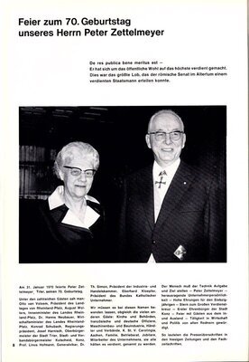 "Die Dampfwalze" war die Werkszeitschift der Firma Zellemeyer in Konz. Das vorliegende Exemplar mit der Nr. 42/70 dürfte eines der letzten, wenn nicht sogar das Letzte Exemplar gewesen sein. Unter der Überschift "Werkschronik des Jahres 1970" entstand ein Streifzug durch das laufende Jahr 1970, in dem alle wichtigen Ereignisse festgehalten wurden. Der Rückblick auf das Jahr 1970 berichtet über die überhitzten Konjuntur und ihre Auswirkungen auf das Unternehmen. Der Staat musste eingreifen, kürzte Ausgaben und sperrte Bauaufträge. Für Zettelmeyer eine schwierige Zeit. Im Januar 1970 wurde Peter Zettelmeyer 70 Jahre. Hochrangige Persönlichkeiten aus Politik und Wirtschaft waren unter den Gästen. So der Regierungspräsident, K.Schubach, der Wirtschaftminister Rhld. Pfalz, der Innenminister Rhld. Pfalz, Dr. Hans Neubauer, der Oberbürgemeister Hans Harnisch sowie hohe kirchl. Vertreter. In diesem Zusammenhang bekam Peter Zettelmeyer das Bundesverdienstkreuz überreicht und wird Ehrenbürger der Stadt Konz.