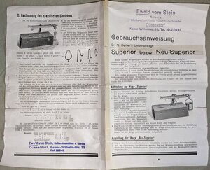 Es handelt sich um die Waage „Dr. N. Gerbers Universalwaage Superior“, eine ungleicharmige Balkenwaage mit einer Waagschale. Das Konvolut besteht aus der eigentlichen Waage mit Holzkasten, Waagebalken, Skalenblatt, Waagschale und Reitern, die als Gewichte auf dem Skalenblatt aufgesetzt werden konnten. Darüber hinaus findet sich bei der Waage eine erhebliche Menge an Zubehör: Ein Becherchen und eine Petroleumlampe zum Erhitzen von Butter und Margarine, eine Spatel, ein Glaszylinder, eine Zange, ein Thermometer sowie mehrere Gewichte. Die Waage war für Molkereien und Händler von Molkereiprodukten bestimmt und konnte für folgende Anwendungen eingesetzt werden: * Bestimmung des Wassergehalts von Butter und Margarine * Bestimmung des Wassergehalts von Quark und Käse * Bestimmung der Einwaage der Rahm-, Butter-, und Käseproben zur Bestimmung des Fettgehalts * Bestimmung des Spezifischen Gewichts einer Flüssigkeit Der Waage liegt eine vierseitige Gebrauchsanleitung bei in der - die Aufstellung der Waage, - die für die jeweilige Anwendung notwendigen Teile des Zubehörs und - Schritt für Schritt die Durchführung der jeweiligen Anwendung beschrieben wird. Fotos der Gebrauchsanleitung finden sich bei den letzten Fotos dieses Datenbankeintrags. Patente und Gebrauchsmuster: Auf dem Kasten befindet sich die Inschrift D.R.G.M. für „Deutsches Reich Gebrauchsmuster“. Leider sind die Gebrauchsmuster aus dieser Zeit nicht erhalten. Erhalten ist ein US-Patent von 1910. Es beschreibt ein Verfahren zur Bestimmung des Fettgehalts von Milch, welches von dieser Waage verwendet wird. Siehe letztes Foto von diesem Datenbankeintrag. Die Waage wurde in der Sendung Bares für Rares am 29. 03. 2025 vom Experten Detlev Kümmel begutachtet und vom Händler Markus Wildhagen ersteigert – siehe https://www.zdf.de/play/shows/bares-fuer-rares-104/bares-fuer-rares-vom-28-maerz-2025-100 ab 30:34 (Expertise) und ab 44:29 (Versteigerung).